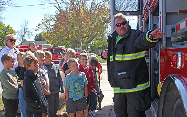 Fire Prevention Week (Oct. 5-11) at Garner-Hayfield-Ventura Preschool and Elementary, included a visited by Garner and Ventura firemen who discussed with students about fire safety and what to do in an emergency. Fireman Al Kuhlman explains the function of various pieces of equipment aboard the fire truck to a group of 2nd graders. Rebecca Peter | The Leader