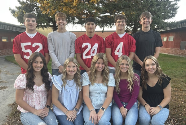 Candidates for Homecoming King and Queen. Senior Queen Candidates (L-R) Charlie Bruggeman, Brinley Hiscocks, Claire Hiscocks, Aubrey Madson, Cooper Sobek. Senior King Candidates (L-R) Carson Bruns, Isaiah Collins, Gustavo Gomez, Teague Smith, Kaden VanEpps.